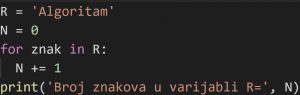 Kada krećemo brojiti slova u riječi, zapravo imamo nula slova, pa je to početna vrijednost. U ovom primjeru koristimo slovo “N” kao našu varijablu, ali naziv za varijablu može biti gotovo bilo što.